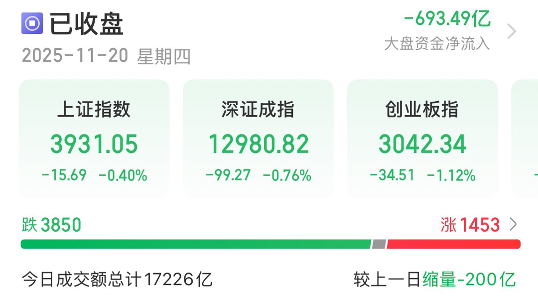 A股三大指数集体收跌,截至收盘,上证指数跌0.40%,深证成指跌0.76%,创业板指跌1.12%,北证50跌1.00%。沪深京三市全天成交额17226亿元,较上日缩量200亿元。全市场超3850只个股下跌。