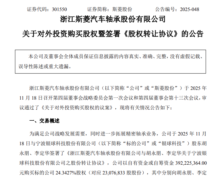 近日,浙江斯菱汽车轴承股份有限公司(以下简称“斯菱股份”)发布公告称,与宁波银球科技股份有限公司(以下简称“银球科技”)股东胡永朋、李定华签署了《股份转让协议》。
