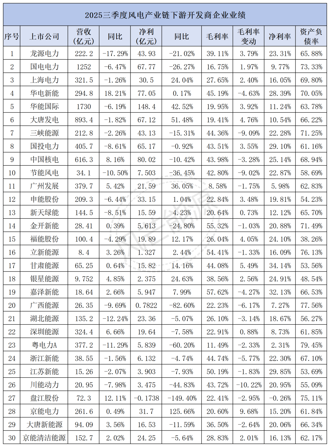 2025年三季度风电产业链下游开发商企业呈现营收和净利分化、毛利率涨跌互现的特点。