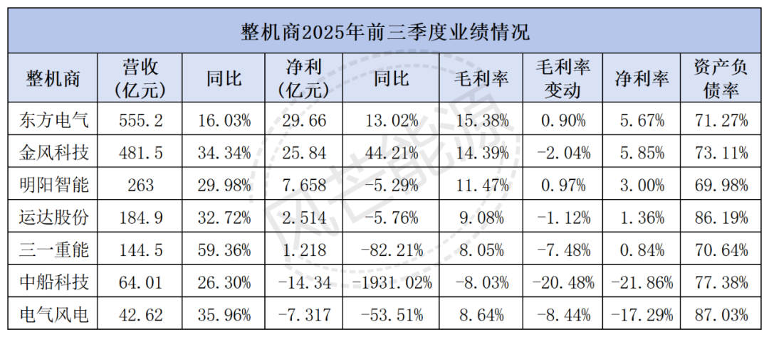 然而,尽管收入普遍增长,但盈利却分化显著。7家整机商中,仅东方电气及金风科技维持净利润增势,分别同比增长13.02%、44.21%;剩余5家整机商净利润均出现不同程度的下滑,其中,降幅最高可达1931.02%。