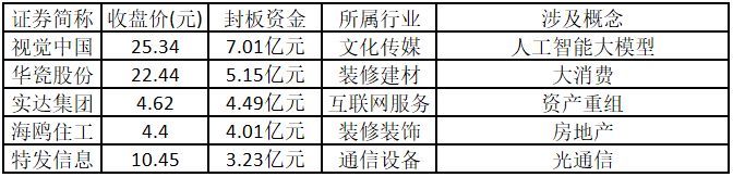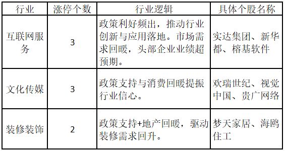 从行业特征来看,今日涨停板个股中,互联网服务、文化传媒、装修装饰行业的个股最多。