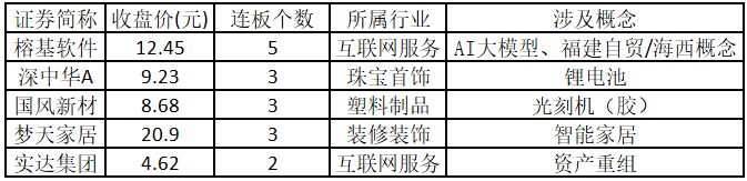 从连板情况来看,今日首板个股有17只;2连板的个股有3只;3连板及以上的个股有4只。今日连板数排名前5的个股包括榕基软件、深中华A、国风新材、梦天家居、实达集团,具体如下表所示。