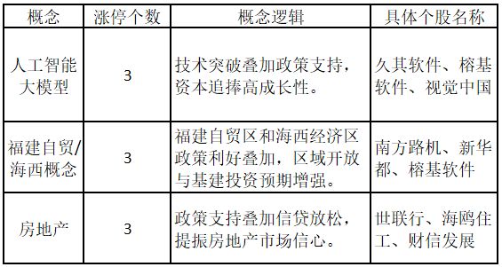 从概念特征来看,今日涨停板个股中,人工智能大模型、福建自贸/海西概念、房地产概念的个股最多。