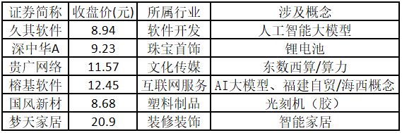 涨停板个股中,股价创出近一年新高的个股有6只(不包括创出历史新高的个股),包括久其软件、深中华A、贵广网络、榕基软件、国风新材、梦天家居,具体如下表所示。欢迎大家关注微信公众号“道达号”,其“道达涨停复盘”栏目为大家解读。