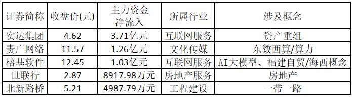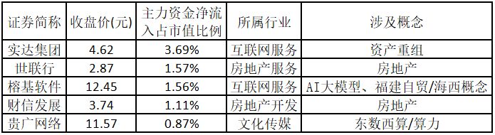 主力资金净流入金额占市值比例排名前5的个股分别为实达集团、世联行、榕基软件、财信发展、贵广网络。