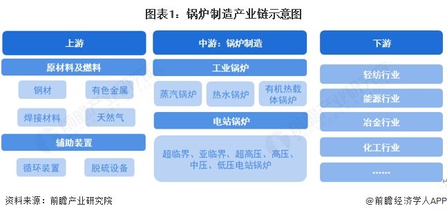 中国锅炉制造产业的上游主要为原材料与辅助设备生产商;中游包括锅炉制造生产环节,包括工业锅炉与电站锅炉;下游则包括轻纺、能源、冶金、化工等行业。