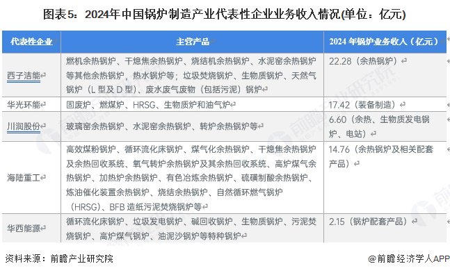 从我国锅炉制造相关上市公司销量情况来看,各企业涵盖产品均较为广泛。2024年,西子洁能、华光环能两家上市企业锅炉业务收入均超过20亿元。