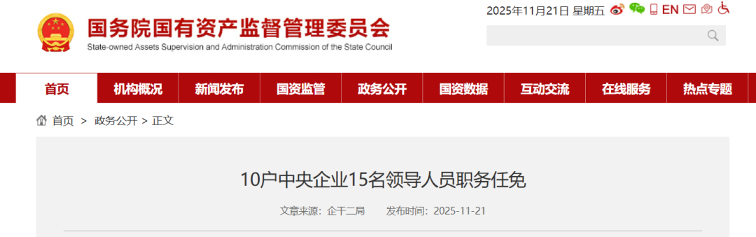 11月21日,国资委公布10户中央企业15名领导人员职务任免。其中: