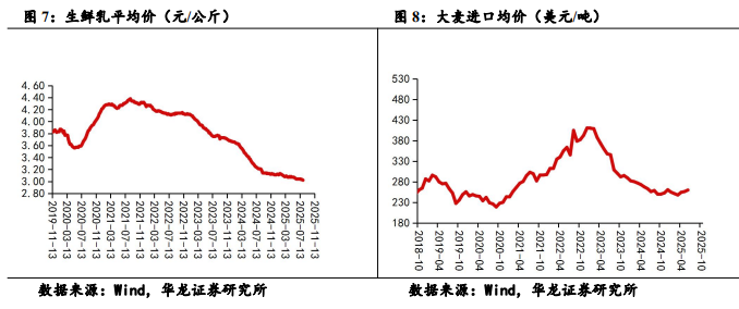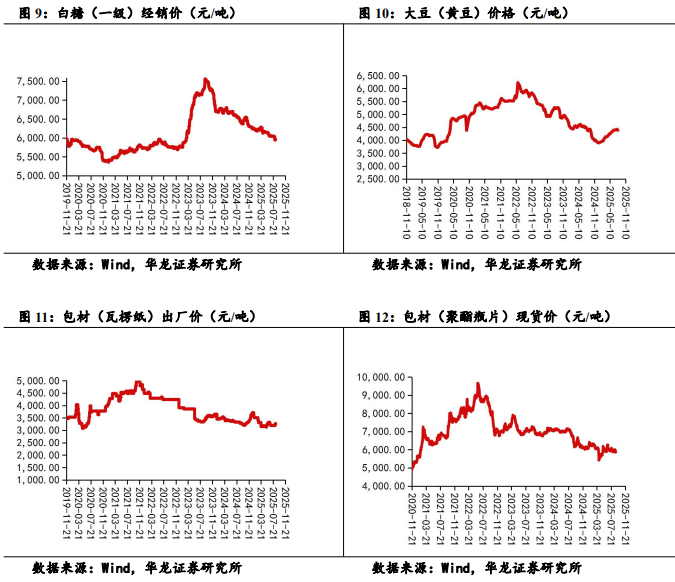 生鲜乳价格小幅提升,截至2025年11月13日,生鲜乳价格为3.03元/公斤,同比下降2.90%,较此前最低价格3.02元/公斤小幅抬升;2025年10月,大麦进口平均单价为257.89美元/吨;2025年11月21日,白糖(一级)经销价为5511.67元/吨;2025年11月10日,大豆价格为4298.30元/吨;2025年11月21日,包材瓦楞纸出厂平均价3890元/吨;2025年11月21日,包材聚酯瓶片现货价为5690元/吨。