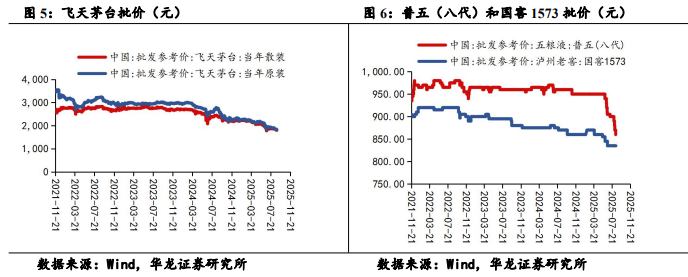 上周(2025年11月17日-11月21日),飞天茅台(散瓶)批价从1655元/瓶下跌5元/瓶至1650元/瓶;飞天茅台(原装)批价从1680元/瓶下跌15元/瓶至1665元/瓶。普五(八代)52度批价维持855元/瓶,国窖1573批价维持850元/瓶。