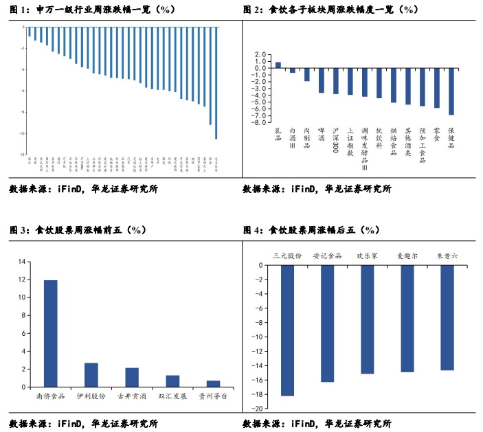 上周(2025年11月17日-11月21日),申万食品饮料指数涨跌幅为-1.44%,在申万一级行业中排名第3位,申万31个行业集体下跌,跌幅较小排名前三的行业分别为银行(-0.89%)、传媒(-1.25%)和食品饮料(-1.44%)。全部子行业涨跌幅分别为,乳品(+0.84%)、白酒(-0.64%)、肉制品(-1.87%)、啤酒(-3.59%)、调味品(-4.13%)、软饮料(-4.39%)、烘焙食品(-5.04%)、其他酒类(-5.31%)、预加工食品(-5.54%)、零食(-5.81%)、保健品(-6.84%),同期上证指数涨跌幅为-3.90%。个股方面,南侨食品(+11.91%)、伊利股份(+2.65%)、古井贡酒(+2.10%)涨幅居前;三元股份(-18.17%)跌幅居前。
