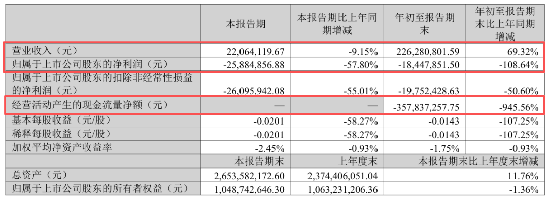 从单季度表现看,第三季度营收仅为2206.41万元,同比下降9.15%,单季度归母净利润为-2588.49万元,同比下降57.8%。