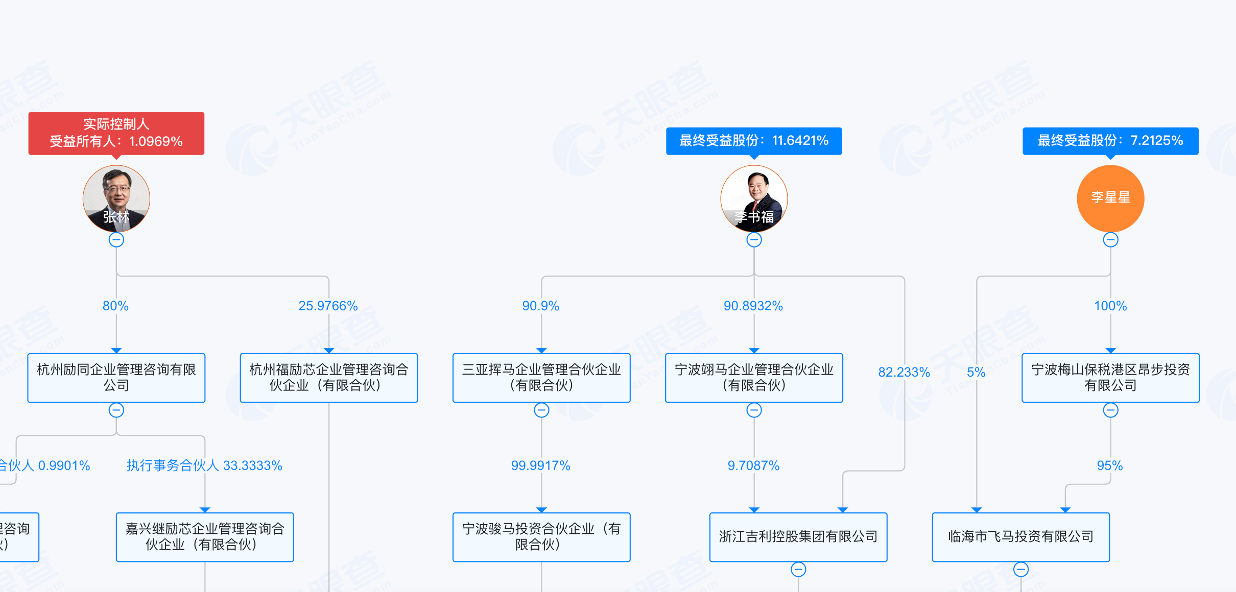 根据天眼查穿透信息,李书福及其子李星星合计持有公司近 20% 的受益股份,是福瑞泰克最大的经济受益方之一。