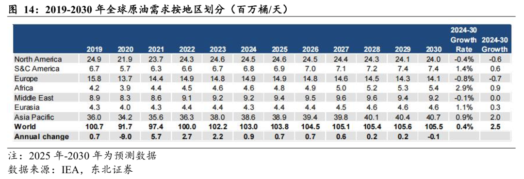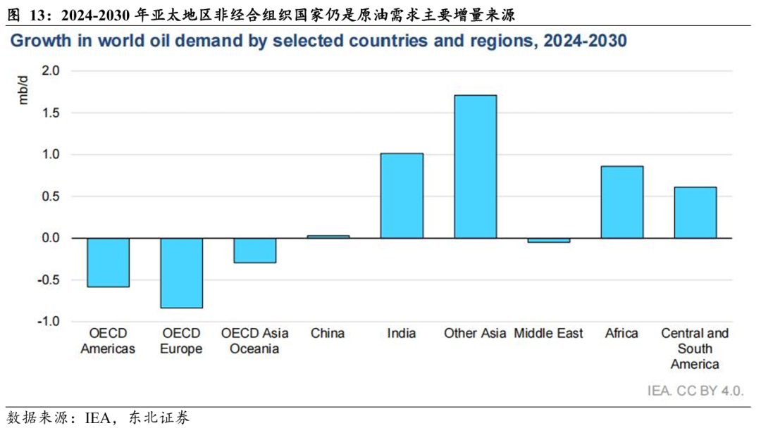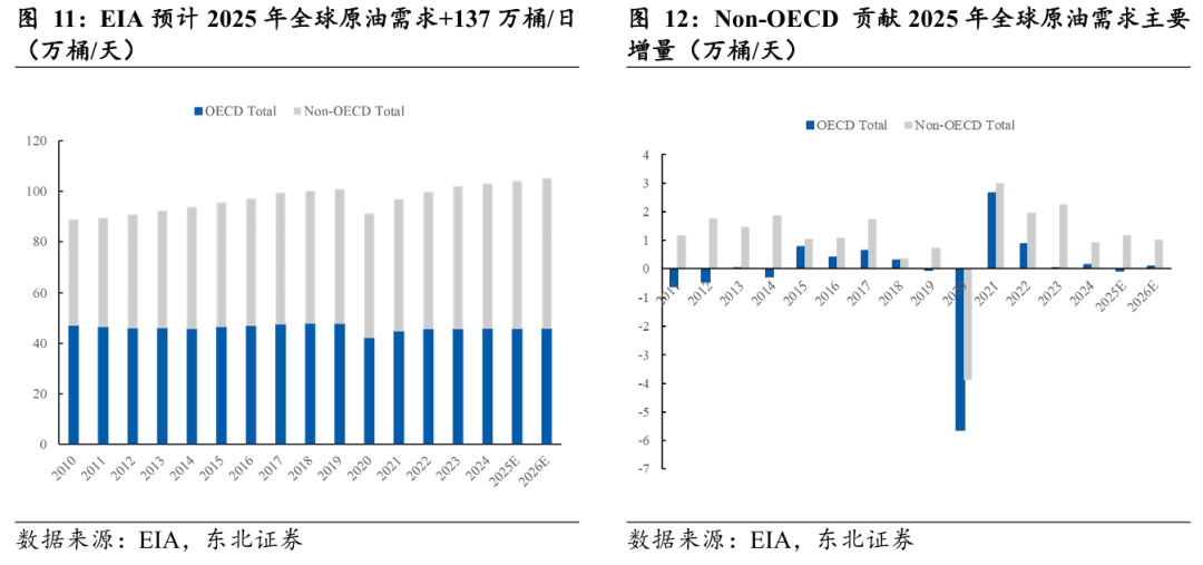 Non-OECD 贡献主要原油需求增量,OECD存量需求保持平稳。据EIA 2025年10月报数据,2024年全球需求量为10291万桶/天,预计2025年全球原油需求量为10399万桶/日,较2024年原油需求+108万桶/日。预计2026年全球原油需求量为10511万桶/日,较2024年原油需求+112万桶/日。