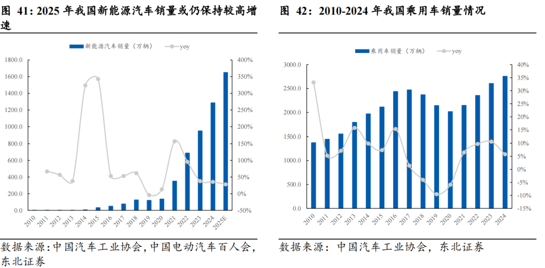 (1)我国新能源汽车销量或仍保持较高增速。我国电动化转型升级进入稳步发展阶段,新能源汽车已成为我国汽车市场的主导力量。据中国汽车工业协会数据,2024年我国新能源汽车销量为1286.6万辆,同比+35.5%,2014-2024年CAGR为67.3%,2025年1至7月,新能源汽车产销量双超820万辆,市场渗透率进一步提升至45%,其中出口130.8万辆,同比增长84.6%。据中国电动汽车百人会,预计2025年我国新能源汽车含出口的销量预计达到1650万辆,增速接近30%,内需有望达到1500万辆,渗透率预计超过55%。