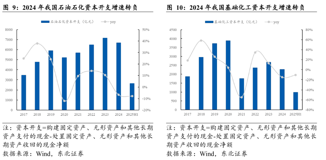 化工行业资本开支增速已转入负增长区间,当前正处于存量产能消化阶段。过去几年,石化化工行业经历了快速产能扩张,但终端需求增长相对滞后,导致行业景气度进入周期底部,企业盈利普遍承压,投资意愿随之趋于谨慎。据Wind数据,“十四五”期间,我国石油石化与基础化工领域的资本开支增速逐步放缓。2024年,石油石化与基础化工资本开支同比增速分别降至-6.6%和-15.2%,正式进入负增长通道。2025H1,这一趋势仍在延续,增速分别为-7.8%和-10.8%。