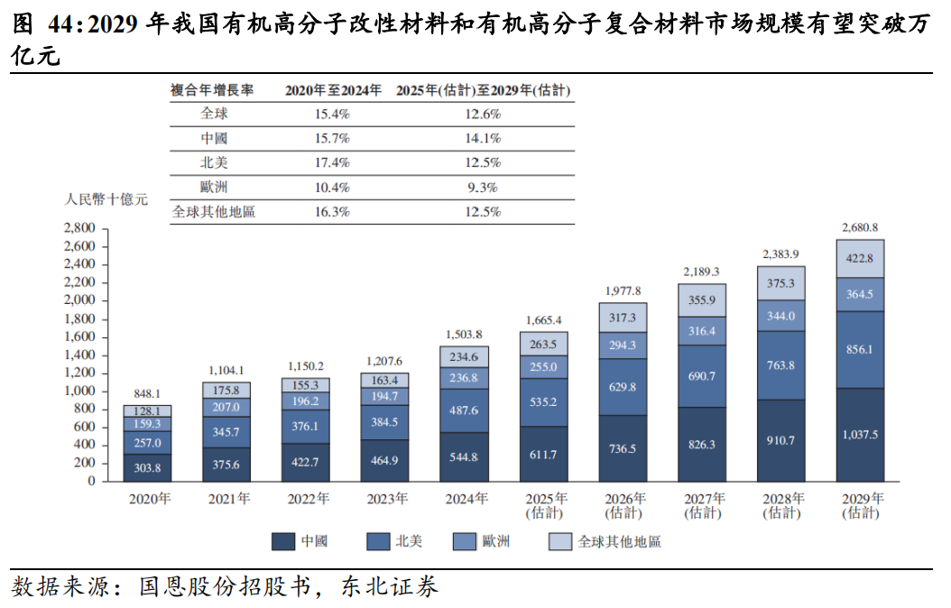 2029年我国有机高分子改性材料和有机高分子复合材料市场规模有望突破万亿元。据弗若斯特沙利文,全球有机高分子改性材料和有机高分子复合材料市场规模从2020年的人民币8,481.0亿元迅速增长至2024年的人民币15,038.0亿元,复合年增长率为15.4%。有机高分子改性材料的强度高和重量轻等特性使其应用范围更为广泛。预计2025年至2029年,市场将以复合年增长率12.6%平稳增长,至2029年达人民币26,808.0亿元。中国有机高分子改性材料和有机高分子复合材料市场规模从2020年的人民币3,038.0亿元上升至2024年的人民币5,448.0亿元,复合年增长率为15.7%。随着有机高分子改性材料和高分子复合材料的大规模使用,该市场将在未来维持高速增长,预计2025年至2029年,市场将以复合年增长率14.1%增长,至2029年达人民币10,375.0亿元。
