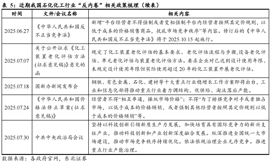 今年以来,化工行业的“反内卷”政策体系持续深化,呈现出从顶层设计向专项治理逐步细化的清晰路径。2025年1月,国家发改委出台《全国统一大市场建设指引(试行)》,旨在破除地方保护与市场分割,统一监管标准,从制度源头遏制重复建设。2025年6月,5部委联合发布老旧装置摸底评估通知,针对投产超 20 年的炼油、化肥等领域装置,从安全、环保、能效维度开展评估,推动低效产能退出。2025年7月中央财经委员会会议明确提出依法治理低价无序竞争,引导落后产能有序退出,同期,发改委、市场监督管理局出台《价格法修正草案(征求意见稿)》,细化低价倾销等不正当价格行为的认定标准,为整治恶性竞争提供法律依据。2025年9月,工信部等七部门出台《石化化工行业稳增长工作方案(2025-2026年)》,将淘汰落后产能与产业升级结合,严控新增炼油产能,科学调控乙烯、对二甲苯等新增产能。