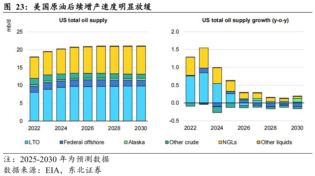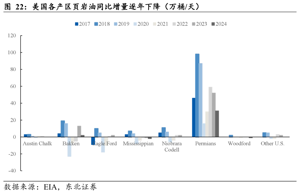 综上,我们认为,美国页岩油当前面临旧井衰竭压力加大以及运营开采成本提升的双重压力,叠加油企高股东回报、降低杠杆、清洁能源投资的行为模式持续,上游资本开支意愿相对较弱。同时钻机数与DUC井数量已下滑至历史低位,美国原油大幅增产能力存疑。页岩油的产量或正在接近拐点,后续增产潜力或面临瓶颈。据EIA数据,2024年美国页岩油产量为885万桶/天,同比+30万桶/天,2023年同期为+72万桶/天。