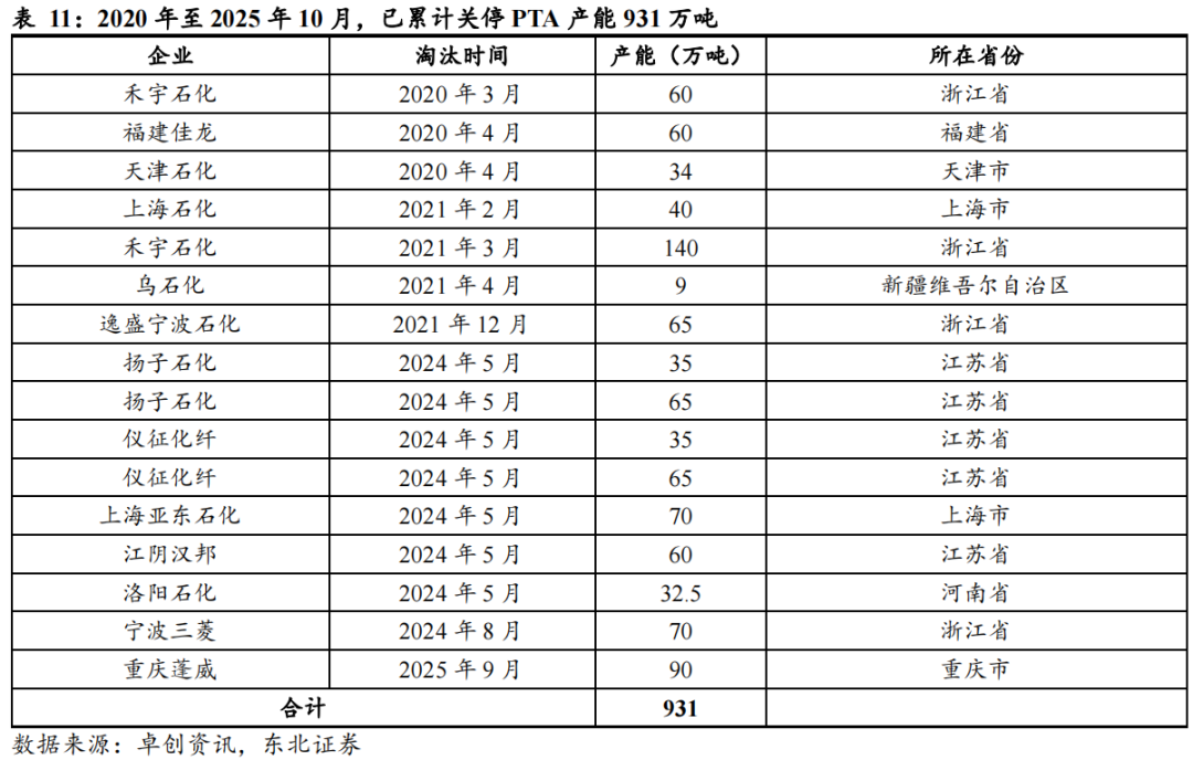 技术迭代带动成本持续优化,小规模老旧装置利润承压。随着科技进步,PTA行业正朝着技术密集型和产业升级型方向发展,新装置的成本优势正逐步倒逼高成本老旧装置出清,促进了行业内的优胜劣汰。此外随着产能的集中,预计行业将出现更明显的规模经济效应,这将有助于降低生产成本,提高整体行业效率。据卓创资讯,2020年以来产能规模150万吨以下的老旧装置已陆续关停,2024年我国PTA淘汰产能432.5万吨,2020年至2025年10月,已累计关停产能931万吨。