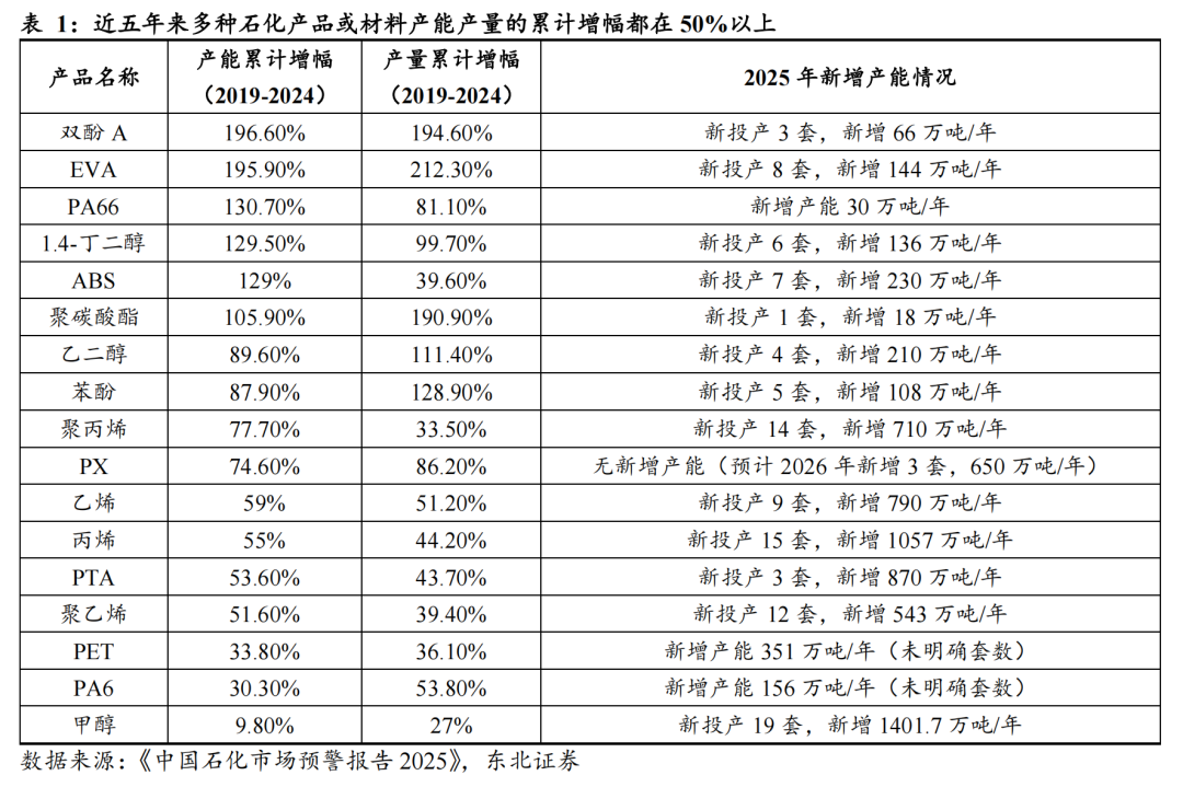 据《中国石化市场预警报告2025》,近五年来多种石化产品或材料产能产量的累计增幅都在50%以上,部分产品的产能远大于国内市场消费量。