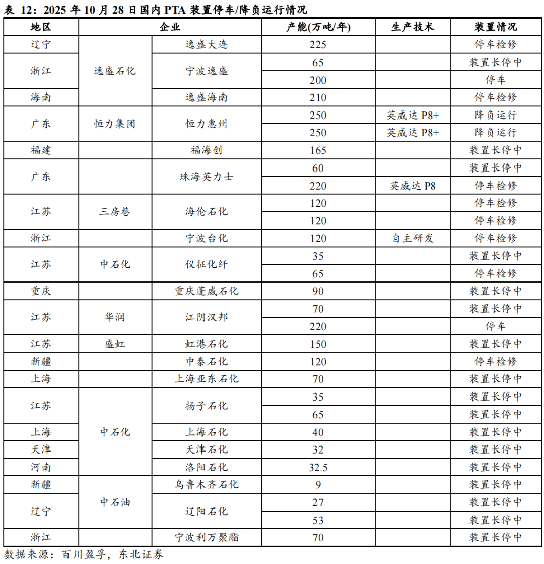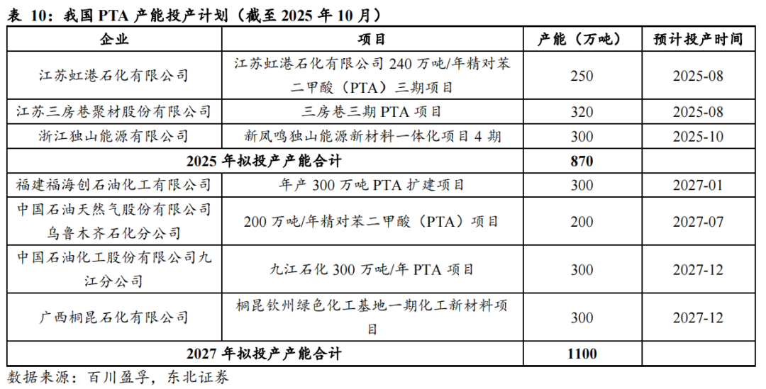 PTA扩产接近尾声,后续产能建设或仍存较大不确定性。展望后续,据百川盈孚数据,2025年8月,虹港(东方盛虹)3期250万吨及海伦石化(三房巷)320万吨装置已相继投产,推动PTA有效产能突破9100万吨。短期内2025Q4独山能源(新凤鸣)4期300万吨装置仍存在投产预期,长期来看,2026年暂无投产计划,2027年或有1100万吨产能投产,但考虑到当前PTA盈利承压,其投产进程尚存在较大不确定性,2025年或已接近国内PTA行业扩产的尾声。