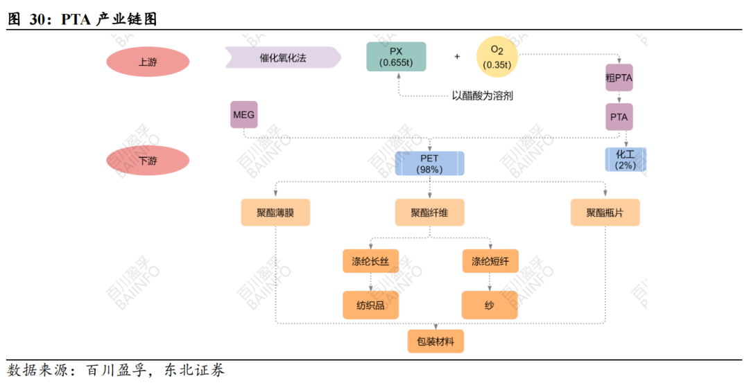 从PTA产业链来看,PTA 全称为精对苯二甲酸,是以 PX 为原料,以醋酸为溶剂制成。主要用于生产制备PET(占比98%),具体产品包括聚脂薄膜、聚酯纤维、聚酯瓶片等,而聚酯纤维又可以进一步制成涤纶长丝、涤纶短纤,用于纺织品、纱等。