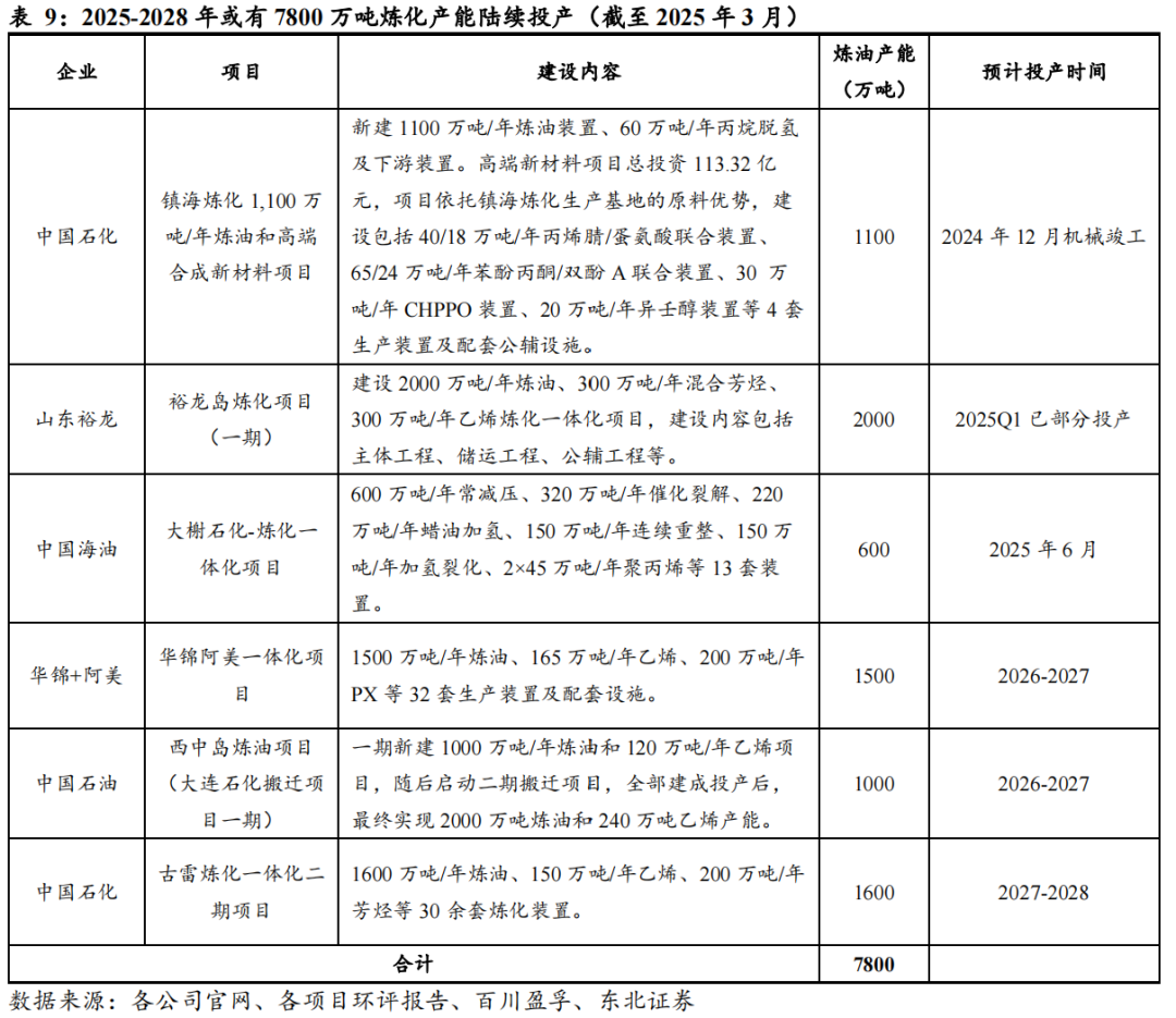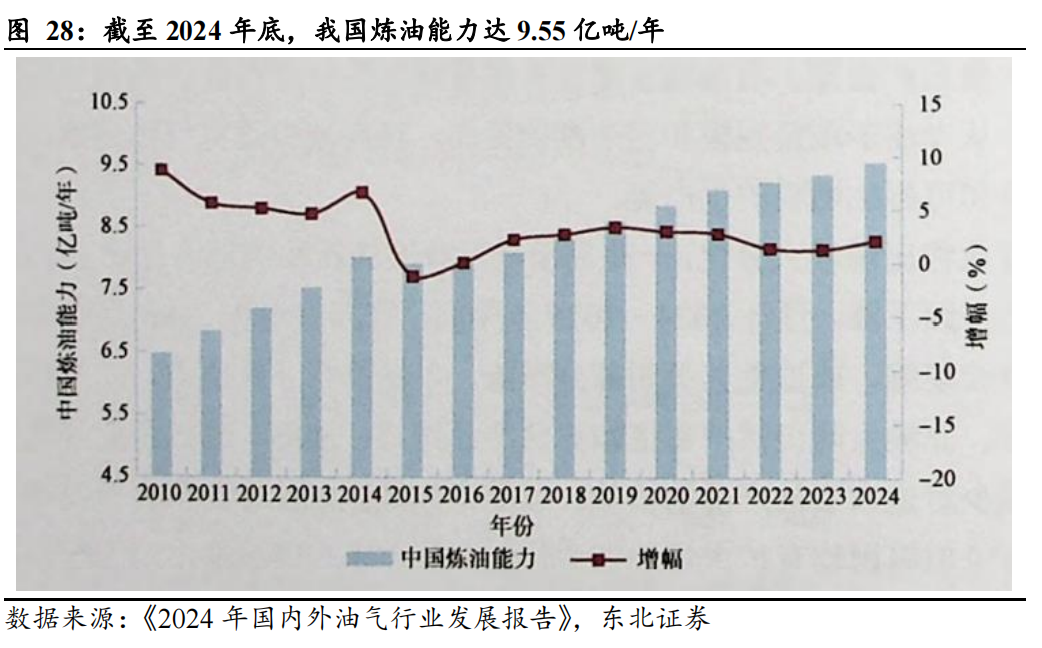 未来炼油能力仍将有一定增长,预计将在2028年左右达峰。据中石油经研院,2025年,国内预计炼油总能力达9.51亿吨/年,减少炼油能力400万吨/年。其中,新增能力600万吨/年,主要来自大榭石化;大连石化继续进行搬迁改造,剩余1000万吨/年炼油装置暂时退出。“十五五”前期,国内炼油能力仍有一定增长,广西石化、吉林石化、齐鲁石化等多个转型升级项目及大连石化、富海石化等产能置换项目将陆续建成投产,预计炼油能力将在2028年左右达峰,峰值为9.8亿吨/年;之后部分落后产能继续退出,预计到“十五五”末,国内炼油能力将降至9.6亿吨/年左右。
