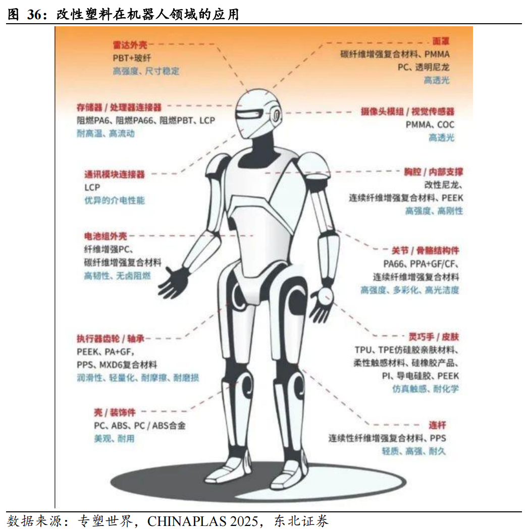 传统上,铝合金、钢等金属材料是机器人结构的主要选择,但金属材料在密度、设计自由度和功能集成方面存在固有局限。改性塑料通过在通用或工程塑料基体中添加增强纤维(如碳纤维、玻璃纤维)、填料、合金化等方式,实现了性能的飞跃,为机器人“以塑代钢”提供了现实可行的解决方案。在人形机器人制造中,不同部位对材料性能要求各异,催生了多样化的改性塑料解决方案:
