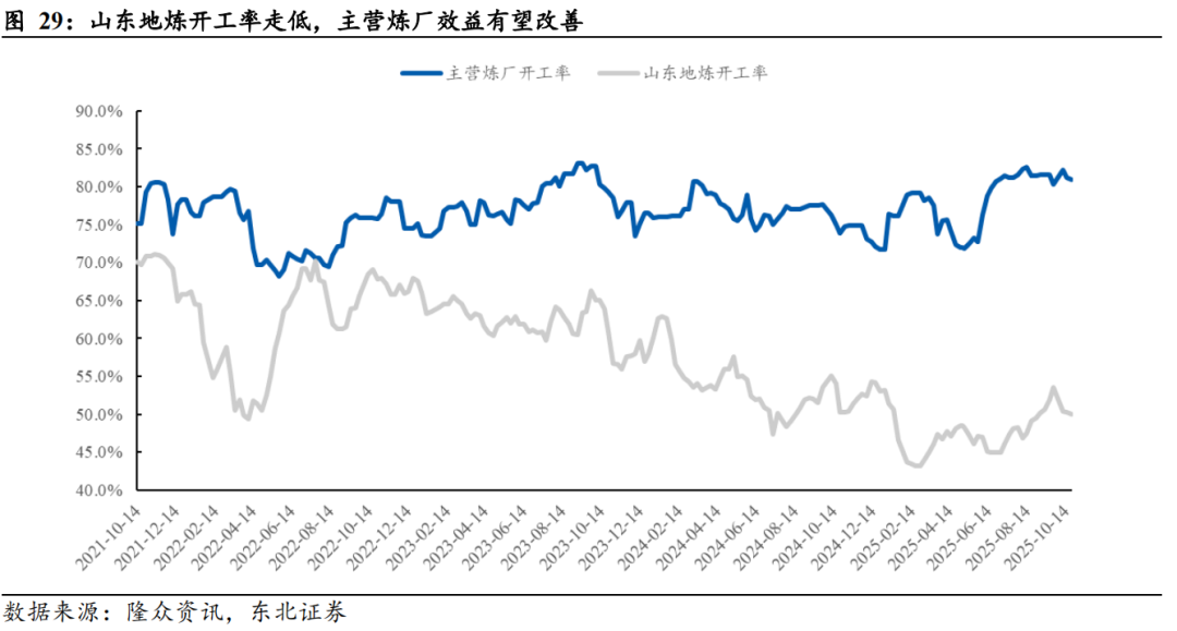 伴随成品油消费税逐步收紧、一系列成品油市场整顿行动的开展,市场逐步向有序化、规范化、公平化转变,营造良好的营商环境的同时,也倒逼部分不法炼厂退出市场,行业出清有望加速。据百川盈孚数据,2025年上半年,主营炼厂开工率维持在70%-80%,而山东地炼开工率已下滑至50%以下。
