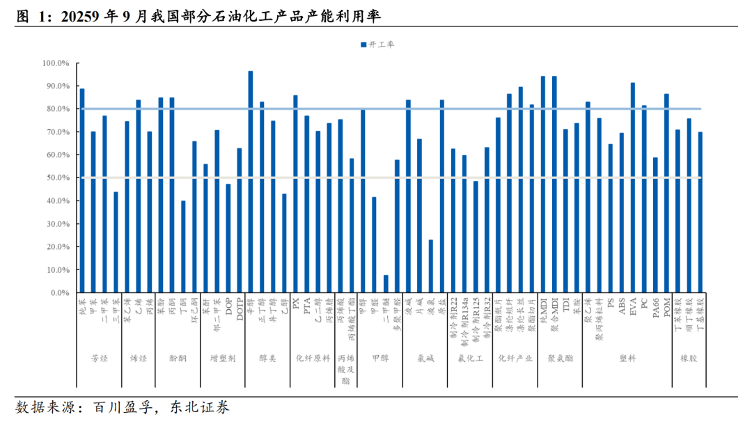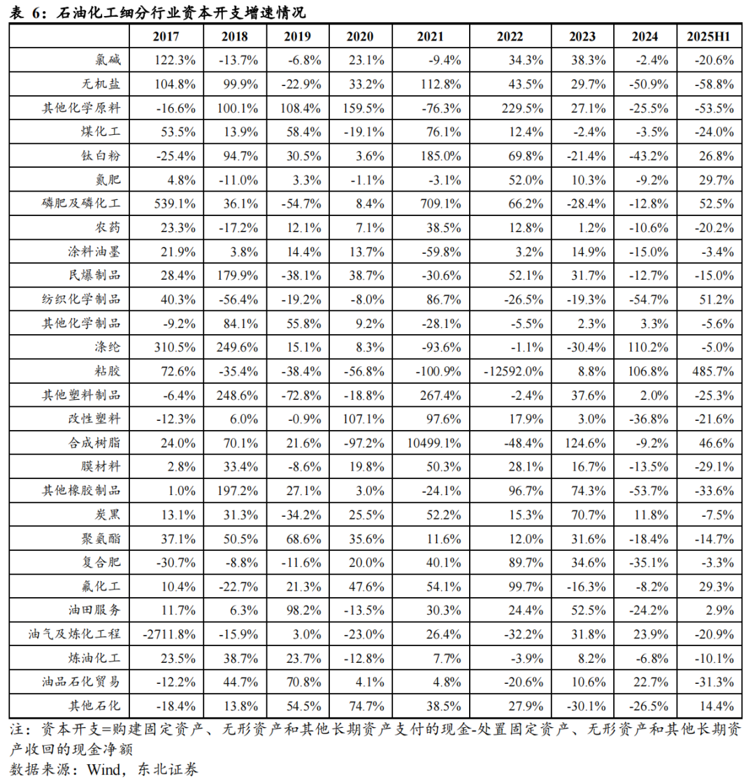 从细分行业看, 2025年上半年仅氟化工、磷肥及磷化工、氮肥、钛白粉、粘胶等少数领域维持较高景气,多数子行业的资本开支增速已转为负值。随着上游资本开支整体放缓,后续在建工程增速预计也将逐步回落。然而,当前行业固定资产规模仍处高位,既有产能与在建产能仍需时间消化。未来,若“反内卷”类产业政策得以明确推进,落后产能有望加速出清,从而推动行业供需结构改善,带动整体景气度回升。