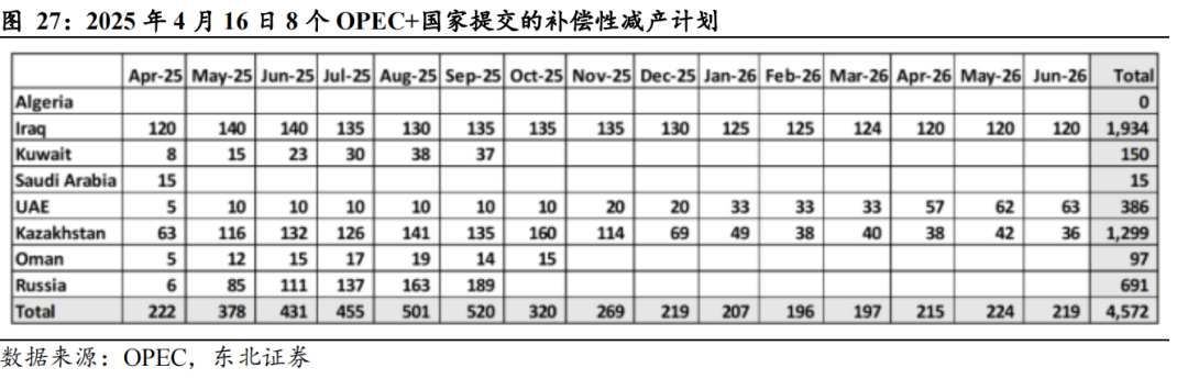 补偿性减产协议对供应端形成一定支撑,但我们认为部分国家补偿性减产协议的执行度较弱,整体效果仍尚待观察。2025年4月16日,沙特阿拉伯、俄罗斯、伊拉克、阿联酋、科威特、哈萨克斯坦、阿尔及利亚、阿曼等8个OPEC+国家提交了补偿性减产计划,5月、6月分别减产37.8万桶、43.1万桶,若执行率100%,则5月份OPEC+的新增供应为3.3万桶/日,6月份减产2万桶/日,对供应端形成一定支撑。但我们认为部分国家补偿性减产协议的执行度较弱,整体效果仍尚待观察。