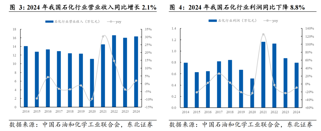 近年来,石化行业整体利润率持续走低。据中国石油和化学工业联合会,2024年石化行业亏损面为23.5%、亏损企业亏损额同比增加19.5%,其中炼油板块亏损面为35%、亏损企业亏损额大幅增加119.6%,化工板块亏损面为23.6%、亏损企业亏损额增加4.4%。盈利能力的持续下滑,使得企业在应对成本波动和市场变化时显得尤为脆弱。