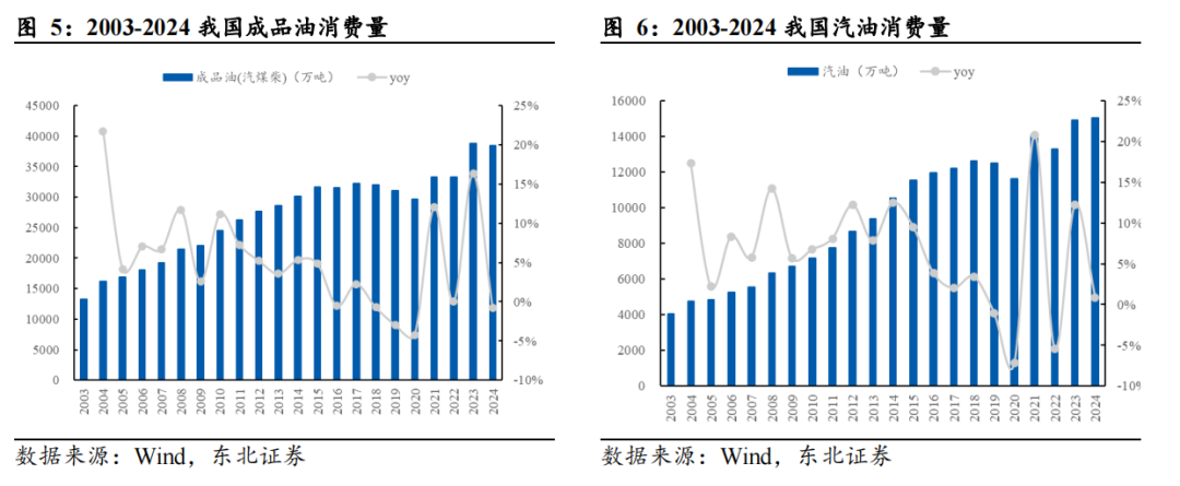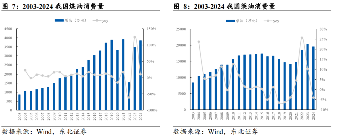 外部环境与行业阶段特征叠加,汽柴油消费拉动力持续转弱。从宏观经济环境看,成品油消费,特别是与宏观经济密切相关的生产性用油变化,取决于宏观经济与行业的增长趋势。2025年,我国经济仍处于调整期,整体来看增速放缓的大趋势并未改变。特别是在房地产、传统基建、建筑施工、采矿、大宗生产加工等“旧动能”领域,产能过剩矛盾凸显,政策传导仍待观察,2024年产业景气程度处于近5年低位(2022年特殊情况除外),产业同比增速出现不同程度回落,难以形成有效增量,带动相关的运输需求和行业用油随之萎缩。