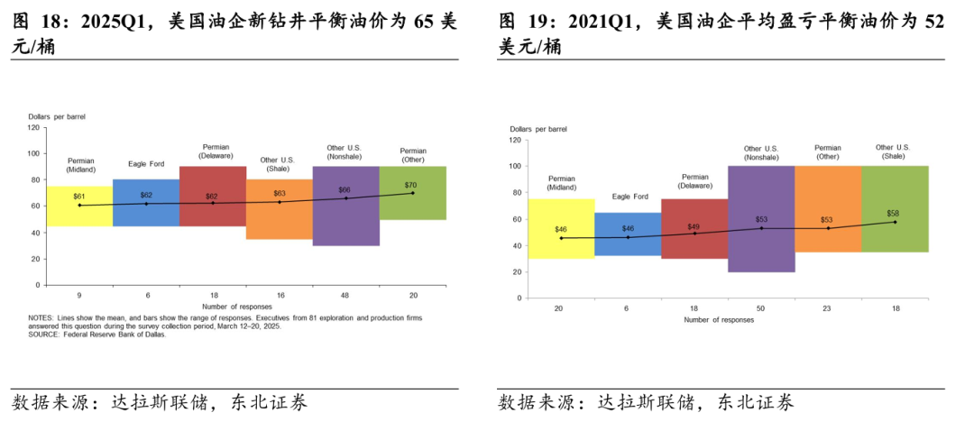 美国油企新钻井盈亏平衡价格已上升至60$-70$,影响油企资本开支意愿。相比特朗普上一任期,原油生产成本呈增长趋势。根据达拉斯联储对100+油企的问卷调查,2025Q1美国各个地区油企存量井的平衡油价为41美元/桶,相较于2021Q1的31美元/桶增长约32.3%。2025Q1美国各个地区油企新钻井平衡油价从61美元/桶到70美元/桶,平均平衡油价为65美元/桶,相较于2021Q1的52美元/桶增长约25.0%。考虑到当前布伦特油价约为70美元/桶,油企资本开支意愿或相对较弱。