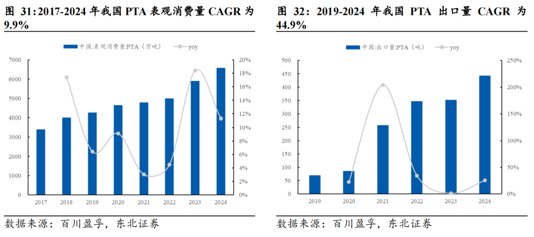 国内PTA表观消费量稳步增长,据百川盈孚数据,2024年我国PTA表观消费量为6557.62万吨,同比+11.3%,2017-2024年消费量CAGR为9.9%。2025年1-9月我国PTA表观消费量为4989.43万吨,同比+3%。出口方面,据百川盈孚数据,2024年我国PTA出口量为441.81吨,同比+25.9%,2019-2024年出口量CAGR为44.9%。
