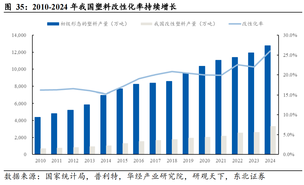 我国塑料产量稳健增长,改性化率不断提高。改性化率(改性塑料产量/塑料产量)是用来衡量改性塑料行业在塑料工业中地位的指标伴随着国内经济的快速发展和“以塑代钢”、“以塑代木”的不断推进,我国塑料改性化率不断提高,改性设备、改性技术不断成熟,改性塑料工业体系也逐步完善,目前已成为全国塑料产业的重要组成部分。据国家统计局数据,我国初级形态塑料产量由2014年的6950.7万吨增长至2024年的12751.6万吨,CAGR为6.3%。据国家统计局、普利特、研观天下等数据,2014-2024年我国改性塑料产量由 1057 万吨增长至3320万吨,我国塑料改性化率由15.2%提升至26.2%。