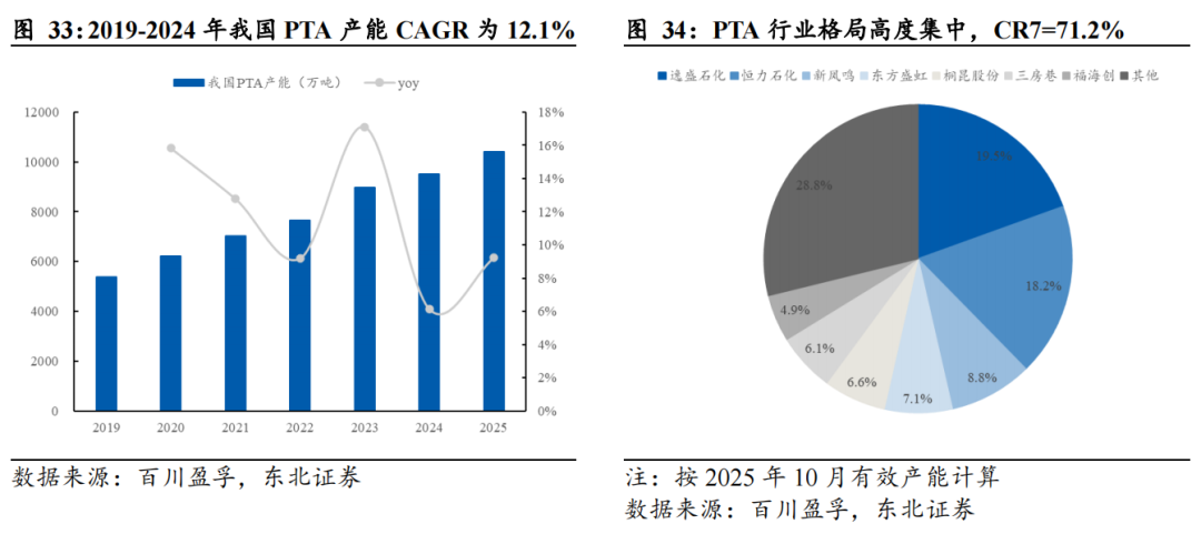 国内PTA产能快速扩张。“十四五”期间,国内PTA产能快速扩张,行业整体过剩压力较大。据百川盈孚数据,截至2025年9月,我国PTA产能为10403.5万吨(有效产能为9135.0万吨),同比+9.24%。2019-2024年我国PTA产能CAGR为12.1%,整体增速快于需求增速。