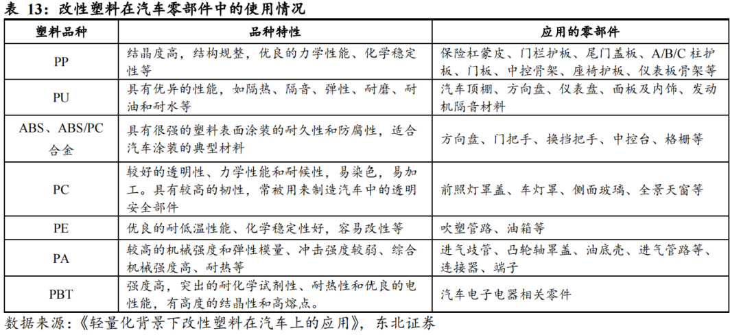 从应用上看,据研观天下,改性塑料广泛用于汽车内、外饰件,结构件及功能件。其中内饰件有中控台、仪表盘、装饰板;外饰件有进气格栅、保险杠及装饰件;结构件有前端框架、立柱骨架;功能件有车灯、进气歧管、燃油箱等均是改性塑料用量较大的汽车零部件。从品种划分,据《轻量化背景下改性塑料在汽车上的应用》,汽车领域用量较多的塑料品种有聚丙烯(PP)、聚氨酯(PUR)、聚酰胺(PA)、聚氯乙烯(PVC)、丙烯腈-丁二烯-苯乙烯塑料(ABS)、聚碳酸酯(PC)等,其中尤以PP、PA、ABS的车用改性塑料最丰富。
