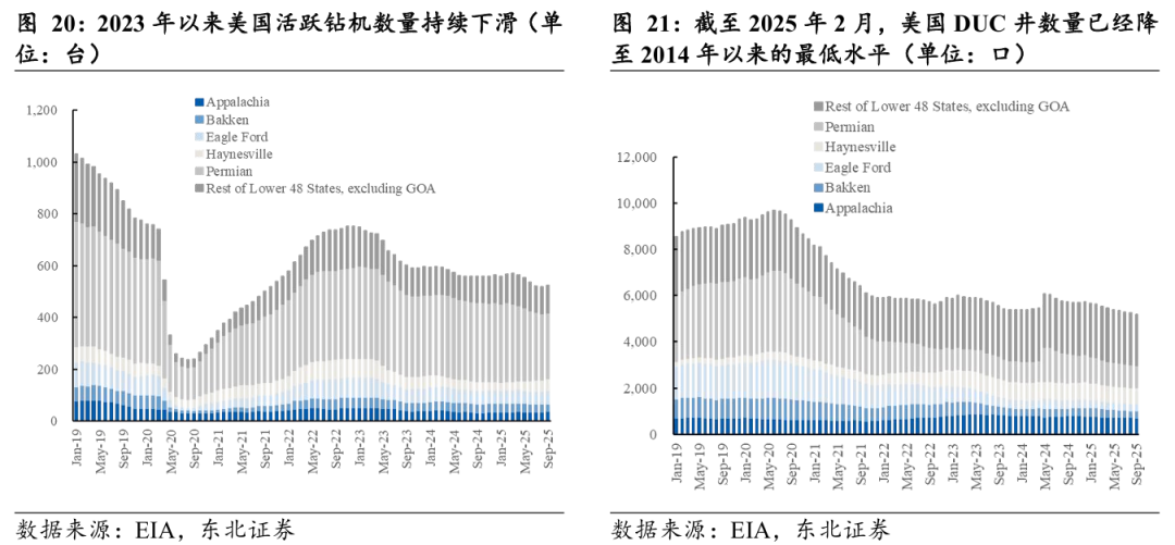 旧井衰竭压力加重+活跃钻机数和DUC井数明显下滑,大幅扩产能力或存疑。由于页岩油高衰减的特性,美国原油增产依赖钻井的持续投入,需要不断钻探新井来补充老井的产量损失。而2023年以来,美国石油活跃钻机数和DUC井数明显下滑,页岩油旧井衰竭压力加重。从钻机数来看,据EIA数据,美国活跃钻机数由2023年初的748台下降约24%至2025年9月的524台。从DUC井数量来看,据EIA数据,截至2025年9月,美国DUC井数量已经降至5192口,为2014年以来的最低水平。
