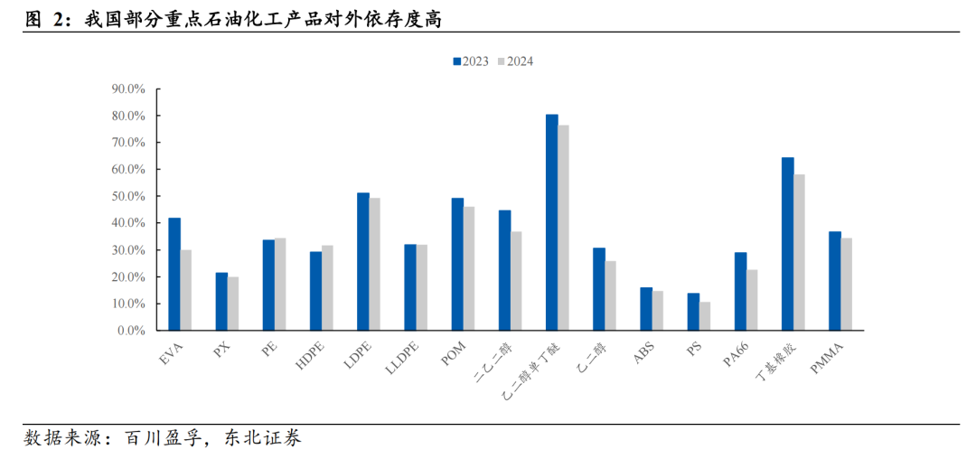 石化行业长期面临基础化学品产能严重过剩、高端产品供给不足的结构性矛盾。据《中国石化报》数据,“十三五”以来,我国石化产业投资大量集中在基础原材料生产制造领域,24种主要化工品产能消费比从2006年的78%提升至2024年的120%(部分化工品超过140%),部分行业产能利用率持续下滑。与此同时,我国高端化工产品发展不足,以化工新材料和高端精细化学品为代表的高端化学品结构性短缺,自给率偏低。据《中国石化报》,我国精细化工发展水平低,2024年化工产业总体精细化率仅为45%,茂金属聚乙烯、特种橡胶、工程塑料等化工新材料整体进口依存度高达46%,营养化学品、电子化学品和光刻胶等行业尚处于起步阶段。