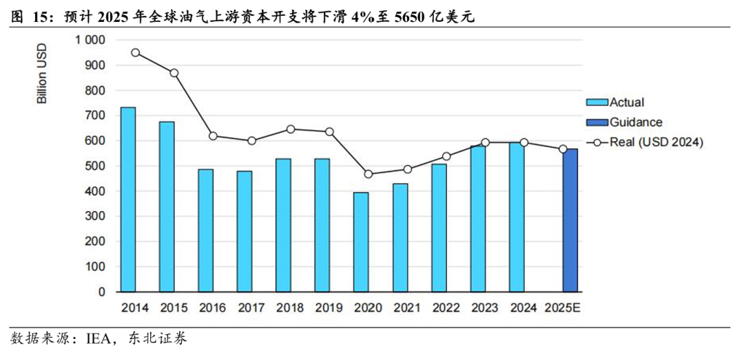 据IEA数据,预计2025年全球油气上游资本开支将下滑4%至5650亿美元,其中(1)原油资本开支预计同比下滑6%至4200亿美元,主要是美国页岩油领域降幅明显,而常规石油项目的投资将保持稳健。此外,受关税政策影响导致的油价走低、关键材料成本上涨带来的生产成本攀升,后续可能还将出现更大规模的投资削减。(2)天然气资本开支同比增长3%至1450亿美元。