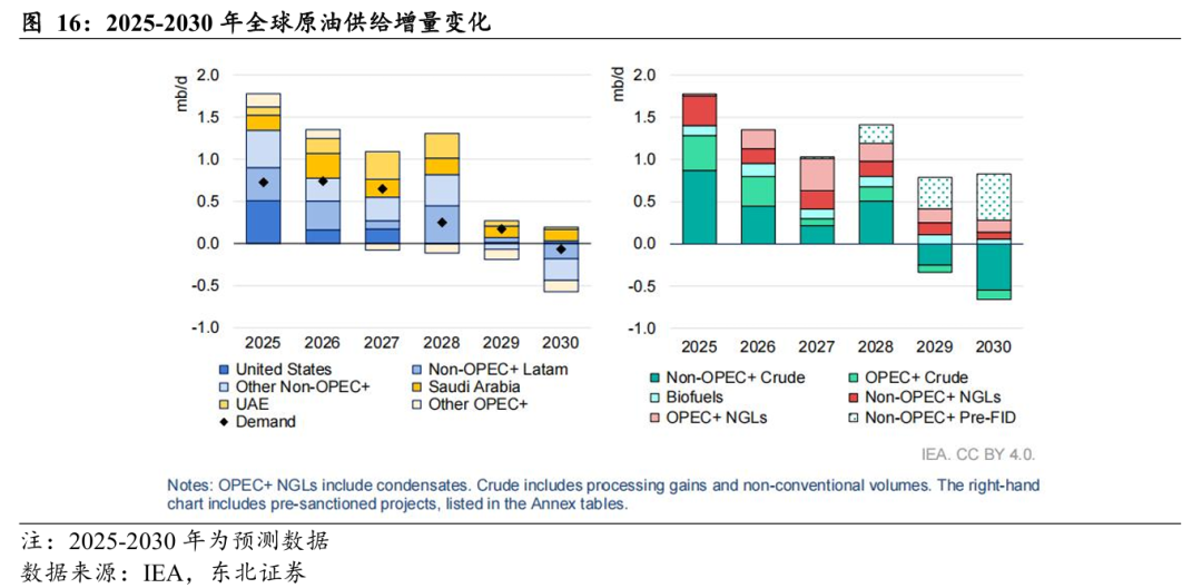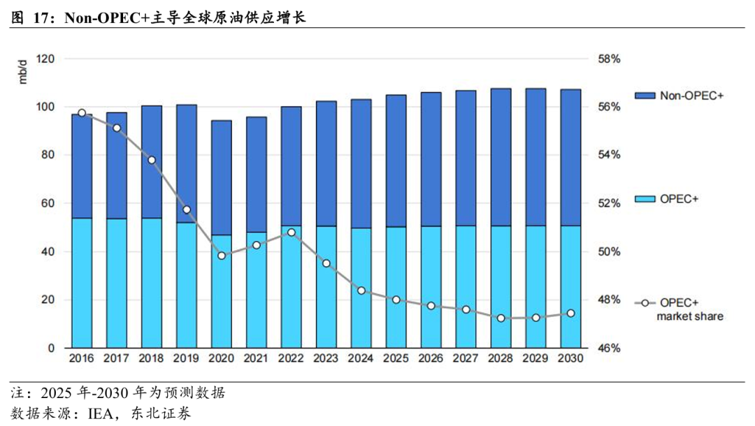 据IEA2025年10月报数据,预计2025年全球原油供给增量为300万桶/天,达到1.061亿桶/天,其中,OPEC+增产140万桶/天,Non-OPEC+增产160万桶/天。展望后续,Non-OPEC+主导全球原油供应增长,OPEC+市场份额或逐步下滑。