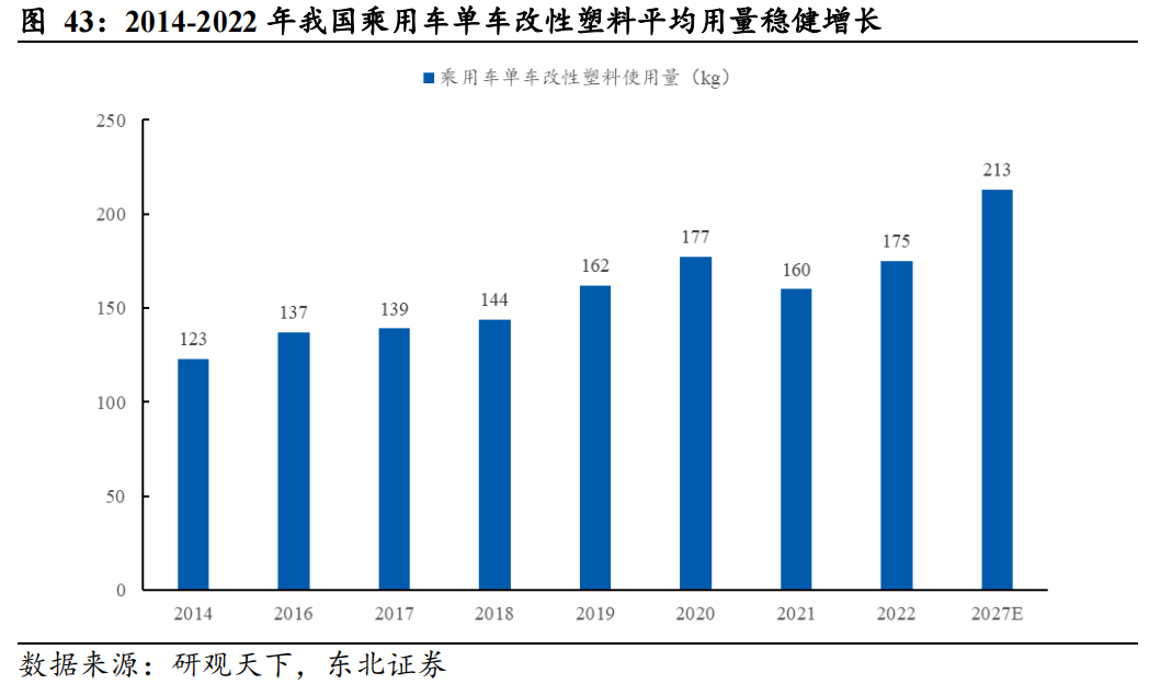 (2)我国乘用车单车改性塑料平均用量仍有较大提升空间。近年来,我国改性塑料在汽车上的用量逐年攀升,单车改性塑料用量已成为汽车设计与制造水平的标志。从单车平均用量上看,我国乘用车单车改性塑料平均用量由2014年的123kg增长至2022年的175kg,预计到2027年将达到213千克。对标海外,美国单车用量在250~310kg,德国在340~410kg,我国仍有较大提升空间。