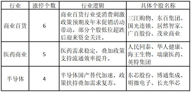 从行业特征来看,今日涨停板个股中,商业百货、医药商业、半导体行业的个股最多。