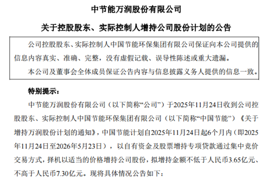 11月25日晚间,山东A股上市公司万润股份(002643.SZ)披露重磅公告,公司控股股东、实际控制人中国节能环保集团有限公司(以下简称“中国节能”)计划自2025年11月24日起6个月内(即2025年11月24日至2026年5月23日),通过集中竞价交易方式增持公司股份,拟增持金额不低于人民币3.65亿元、不高于人民币7.30亿元。