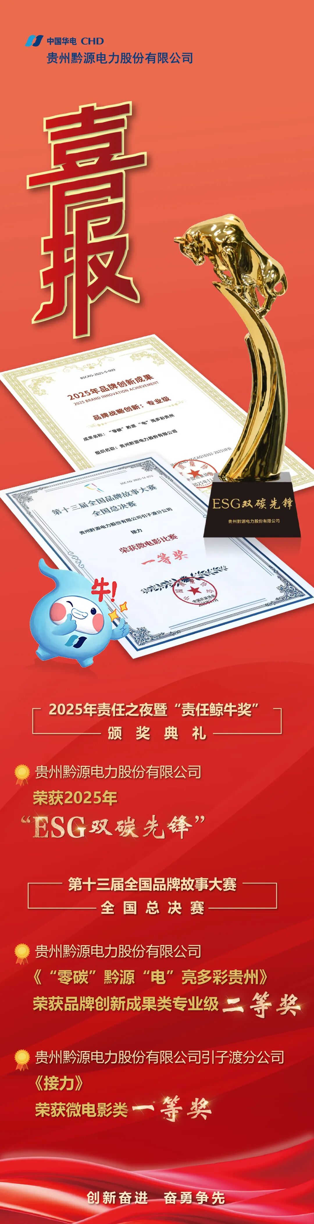 黔源电力深入贯彻集团公司品牌战略,将“中国华电”品牌理念全方位融入企业安全生产、经营管理、绿色发展等实践中。近日,黔源电力及下属的引子渡分公司在多项评选中接连斩获殊荣,展现了公司在品牌建设与可持续发展领域的卓越成效。
