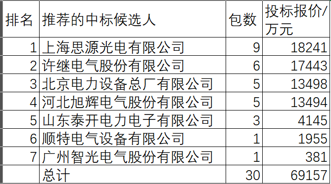 上海思源光电有限公司、许继电气股份有限公司、北京电力设备总厂有限公司、河北旭辉电气股份有限公司4家合计中62676万元,占90.6%,实力出众。
