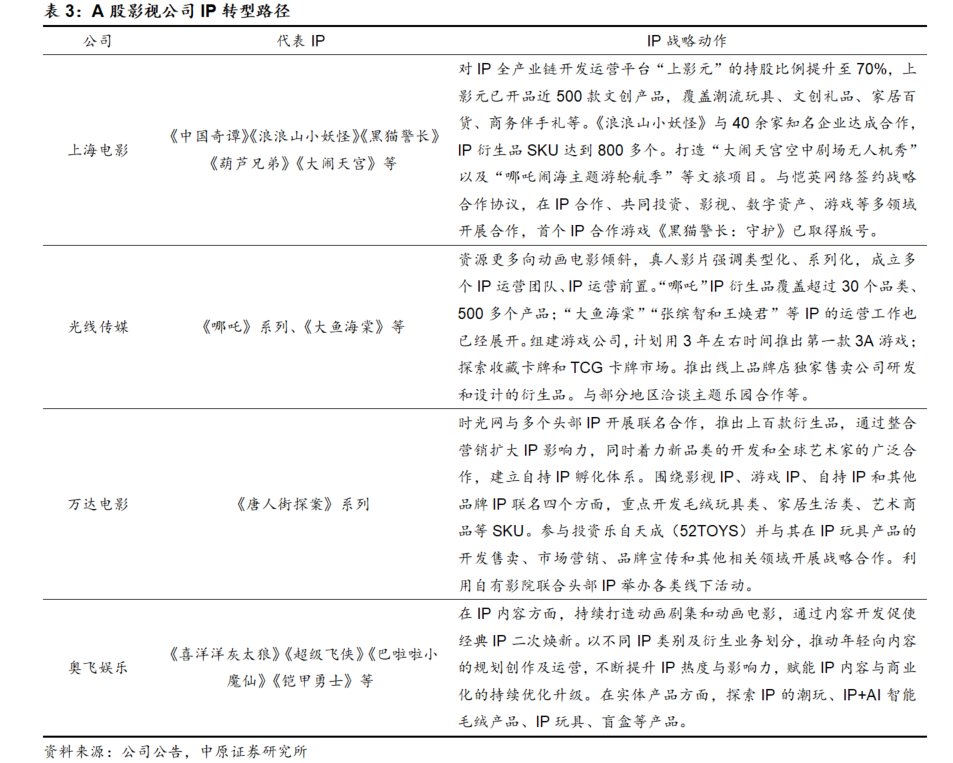 目前包括上海电影、光线传媒、万达电影、奥飞娱乐等影视动漫公司基于各自的战略需要在IP创造和运营上进行了更大力度的布局或转型,初步尝试的领域主要集中于IP对外授权联名以及潮玩、卡牌、玩具、文创等衍生品以及文旅项目、IP快闪店等方面。