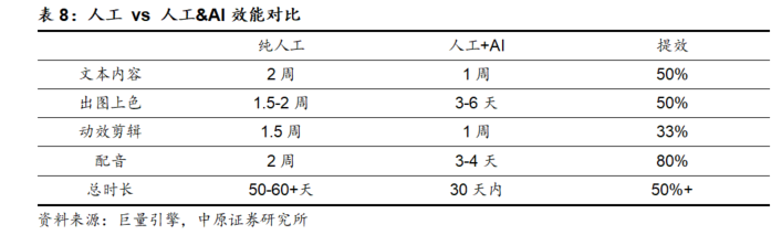 在制作效率方面,相比纯人工制作的漫剧,利用AIGC技术赋能后漫剧生产周期有望缩短50%以上;在成本方面,AI漫剧的单部制作成本已降至10-15万元,仅为传统短剧的四分之一左右。